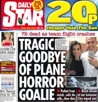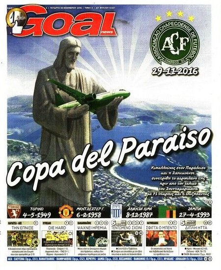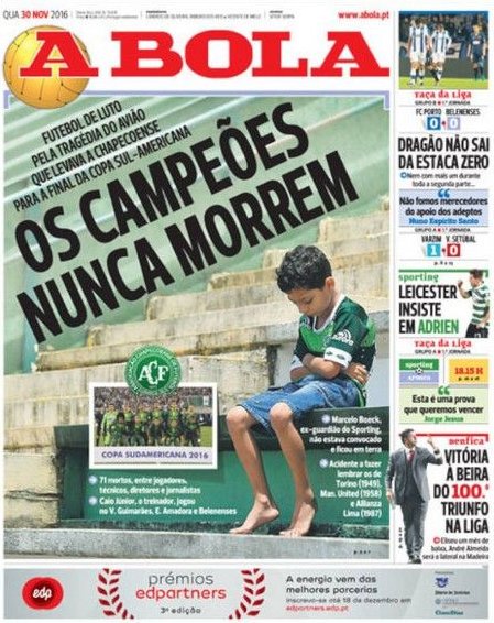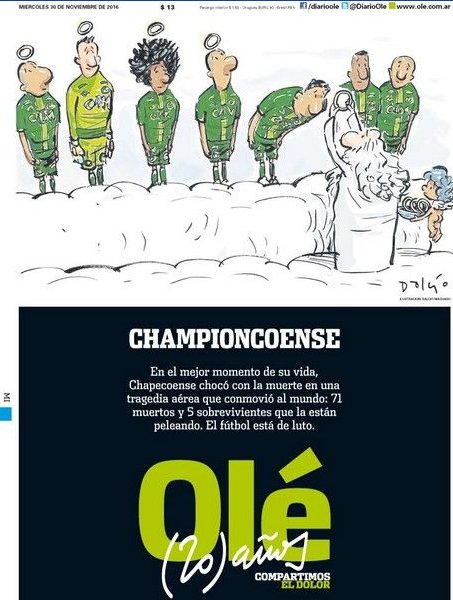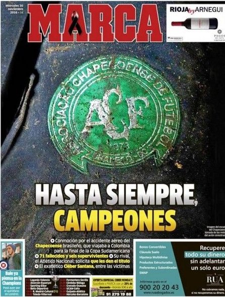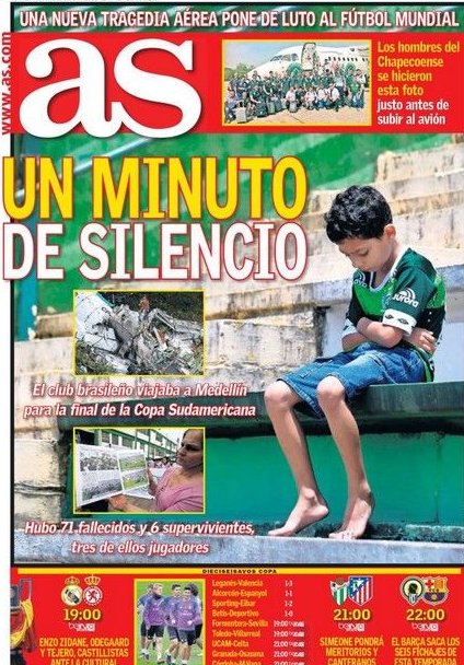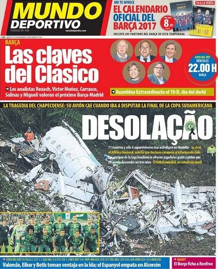 Οι μεγαλύτερες αθλητικές εφημερίδες του κόσμο δεν θα μπορούσαν παρά να έχουν το πρωτοσέλιδό τους αφιερωμένο στο αεροπορικό δυστύχημα της Κολομβίας, το οποίο κόστισε τη ζωή σε 71 ανθρώπους και ξεκλήρισε την ομάδα της Τσαπεκοένσε.
