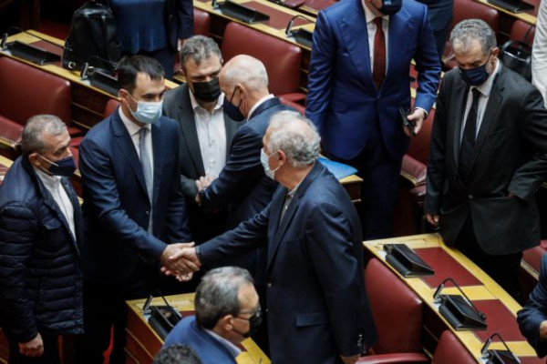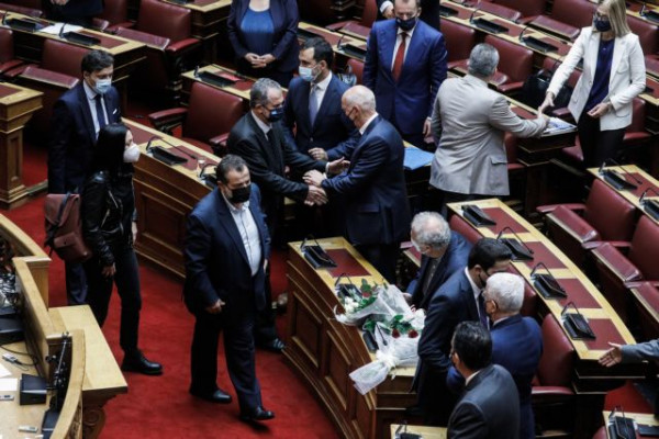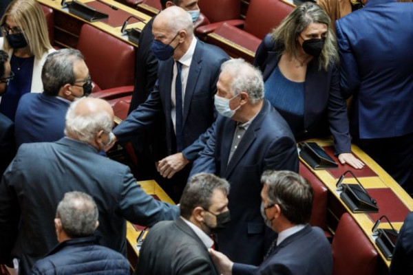 Λίγο μετά ο Γιώργος Παπανδρέου έπεσε στην αγκαλιά του Κώστα Σκανδαλίδη και κάθισαν και οι δύο στις θέσεις ακριβώς δίπλα στο κενό έδρανο της Φώφης Γεννηματά, βουβοί, με το κεφάλι σκυφτό.